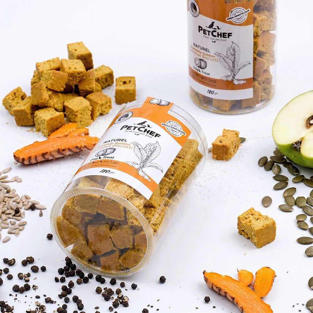 Naturel turmeric golden coconut biscotti köpekler için herhangi bir zamanda ödül veya ikram olarak veya ev yapımı ikramların bir bileşeni olarak verilebilen tamamlayıcı bir evcil hayvan ödül mamasıdır. Ek gıda takviyesi olarak beslerken köpeğinizin diğer yiyeceklerinin alımını azaltınız.