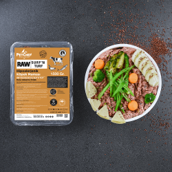 Pet Chef Surf & Turf, Hipoalerjenik Raw (Çiğ) köpek mamalarımız taze ürünlerden harmanlanarak özenle seçilmiş birinci sınıf, yerel malzemelerden oluşmaktadır. Tarım İl Müdürlüğü onaylı ve sertifikalı ürünlerle hazırlanmıştır. Hipoalerjenik Surf & Turf, köpek maması hassasiyet ve alerjisi olan köpekler için mükemmel bir proteindir. Tamamen insan sınıfı Dana eti, Ördek eti,Uskumru balığı ve çeşitli meyve ve sebzelerden yapılmıştır. 3 farklı Et türünden hazırlanan mama farklı proteinler, mineraller ve vitaminler açısından çok zengindir. İçerdiği yüksek demir, omega,potasyum, fosfor,magnezyum ve antioksidan kaynağıdır. Bu mineraller köpeğinizin hücre metabolizmasında önemli bir rol oynar.